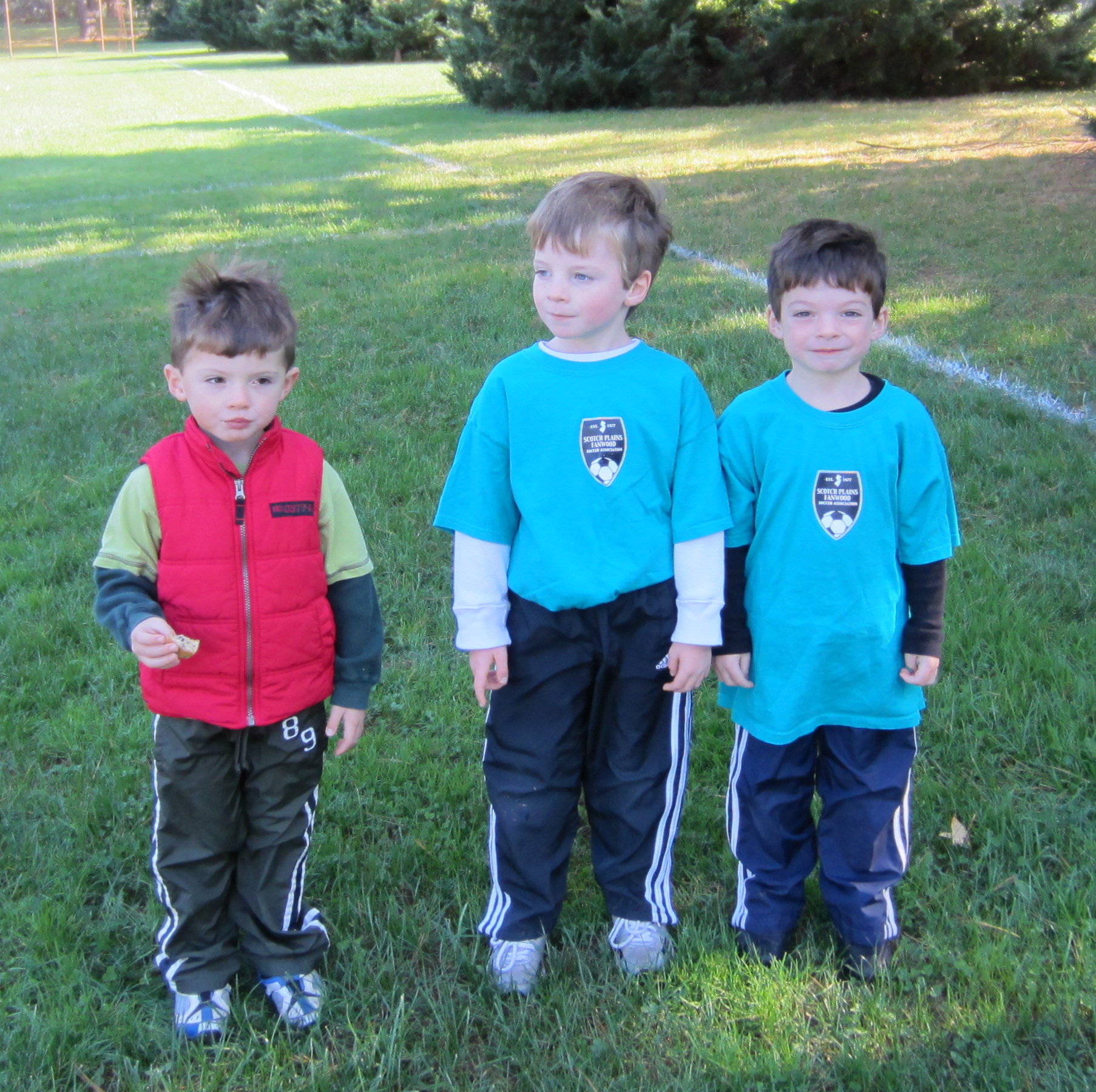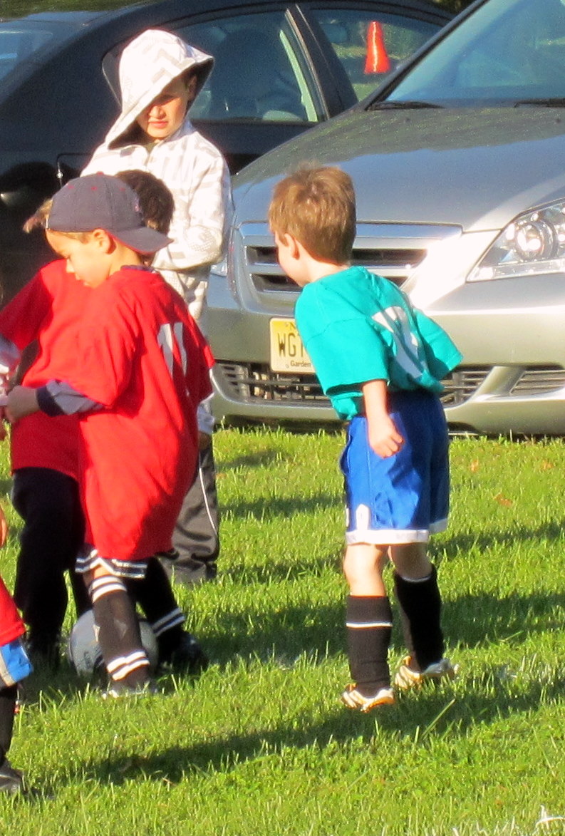 The good news is that we have soccer (after 3 weeks of cancellations due to rain) - the bad news is that it is at 8am. And the best part is the snacks after the game. Here is Daniel looking for the ball, Luke off to practice alone (and thinking of next year when he will be able to play) and I eating the DD munchkins.