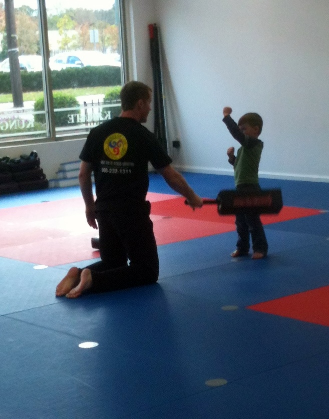 Since my brothers play soccer and I have to wait until next year, Mommy and Daddy decided to enrollment in Martial Arts. Hopefully it will channel my abilities in the right directions. Here I am getting a preliminary "tryout" to see if I can be in the class