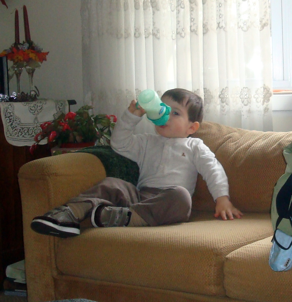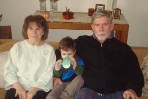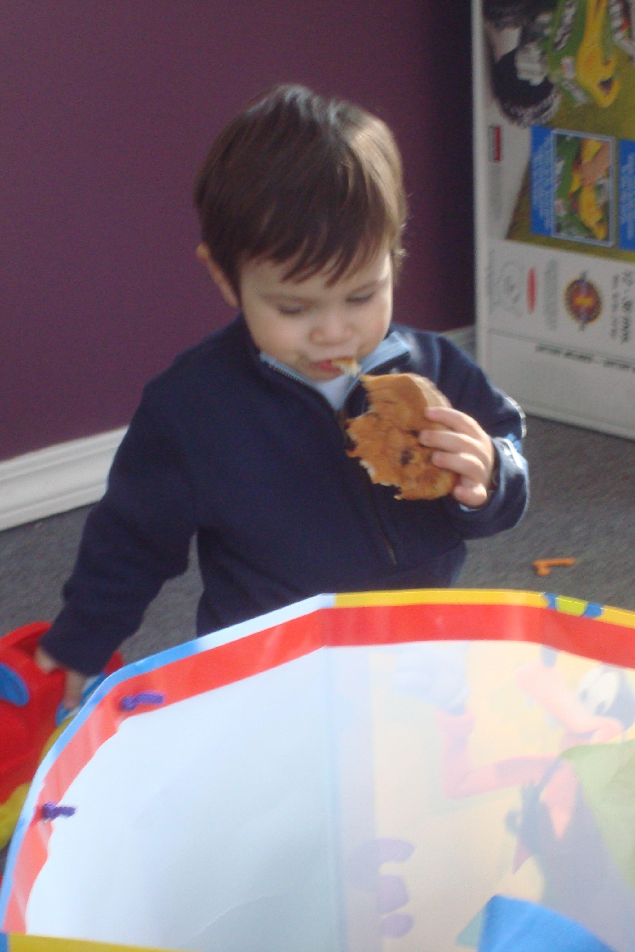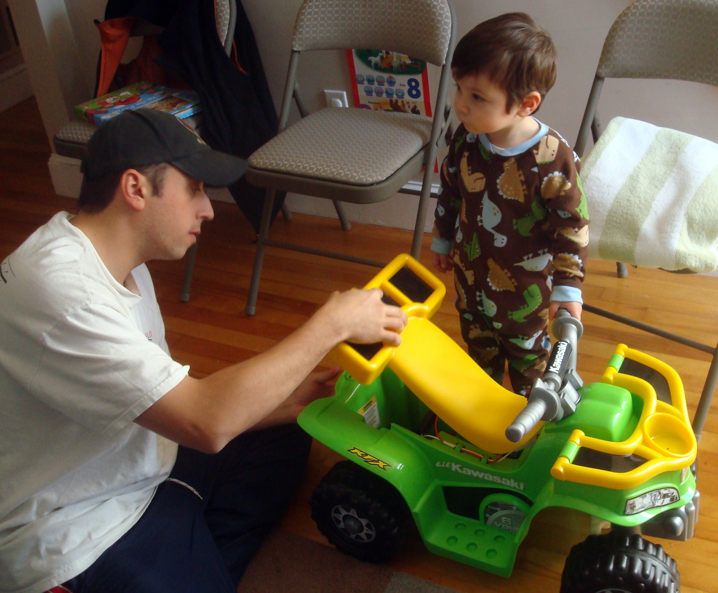 The day after the big celebration. Here is Daddy trying to get a toy together while I make like I am interested but am really watching Mickey Mouse on the TV. Later my Grammy and Grampy came over with cousin Trey for a cup of coffee and to see Mee-Ma and Pop-E again. Trey and I also got to played with the new toys. I also added a video of some of my new dance moves.
