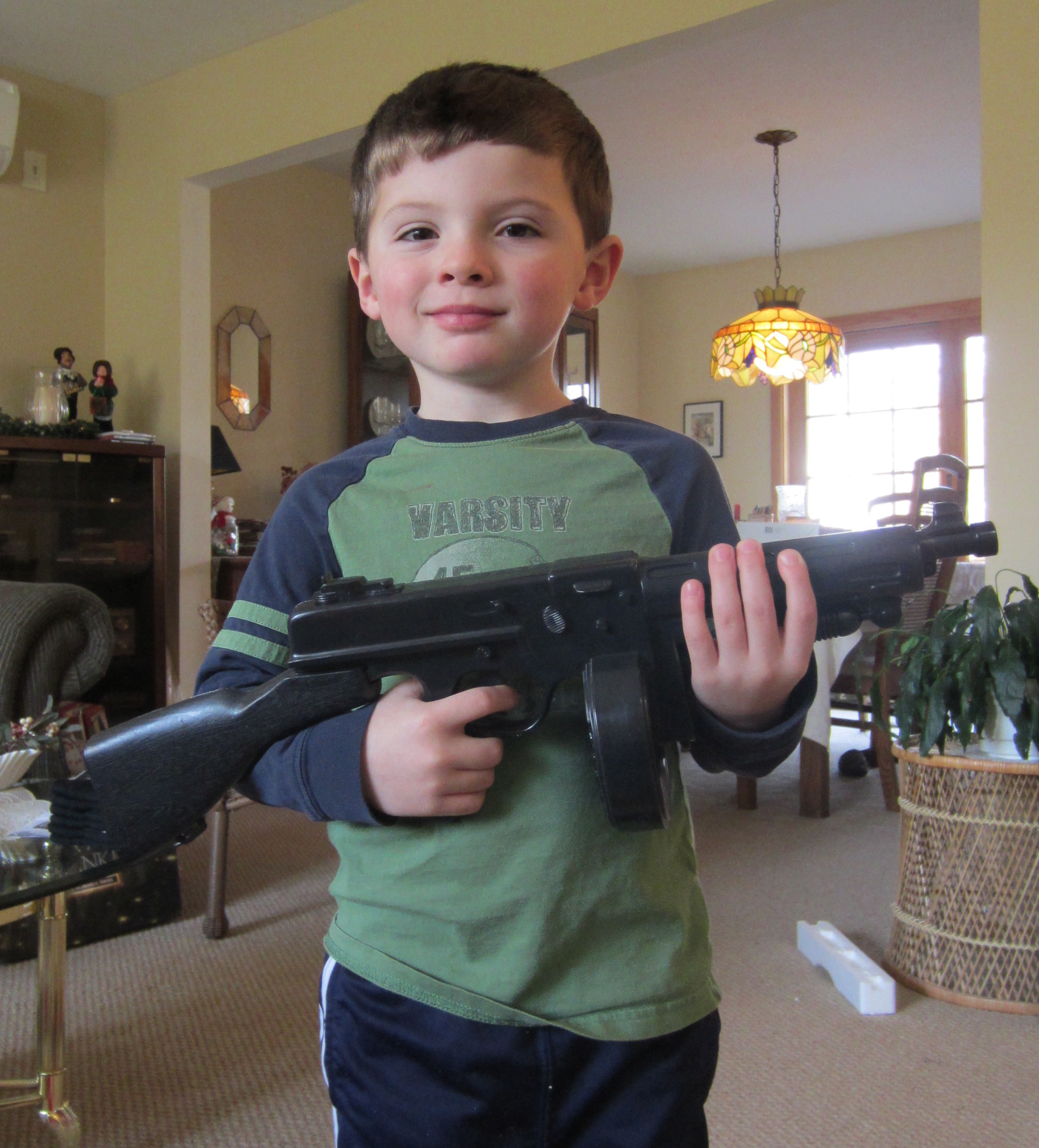 Well here we are celebrating another birthday (we are now 5 years old). Started the day making a trip to MeMa and Pop-E's house to open some Christmas presents. We were waiting to open them since we were hoping that Aunt Jess, Uncle Greg, Jake and Evan would make down for our Birthday. However they decided that Evan was not ready for the car trip - Look at Luke (aka - Baby Face Nelson). He found the Machine Gun at MeMa's and is giving his FBI's "MOST WANTED" look. He is also giving Pop-E some lessons in how to hold the gun. Then it's on to his 2nd favorite thing - SNACKS
