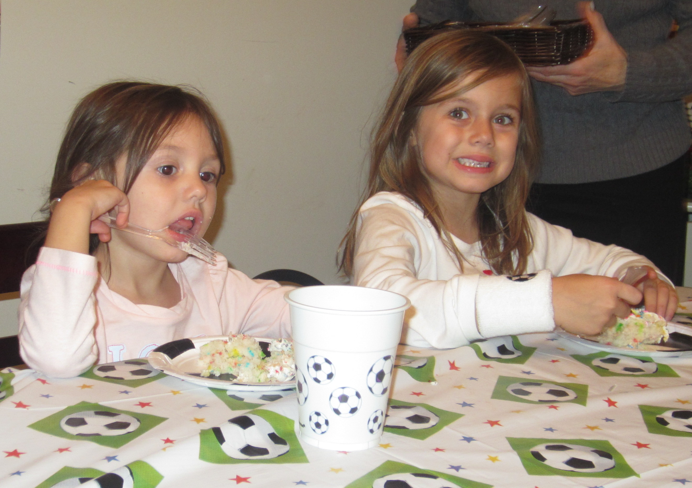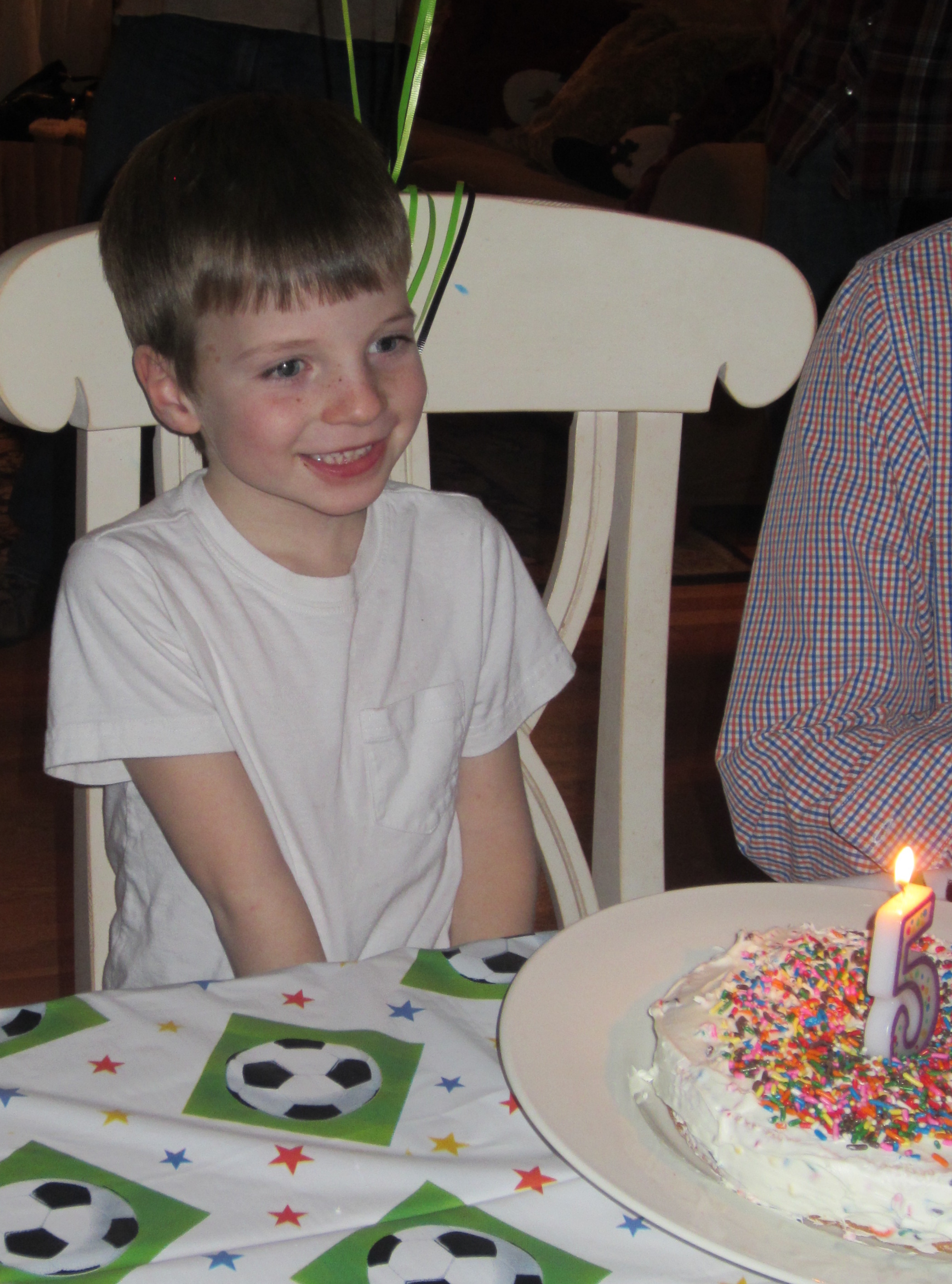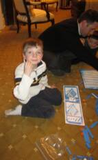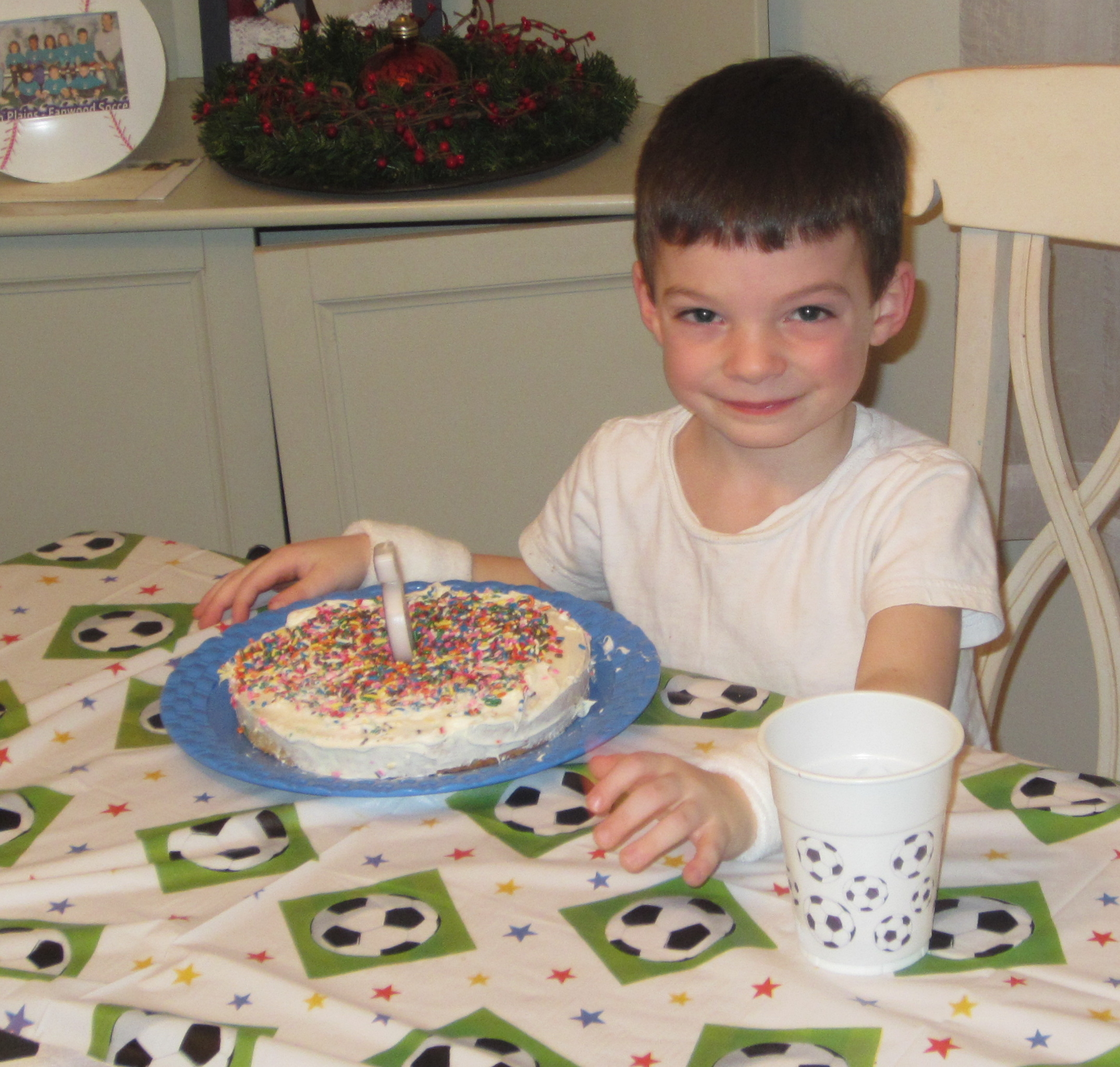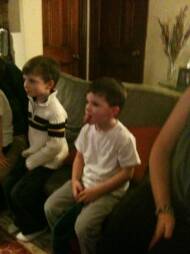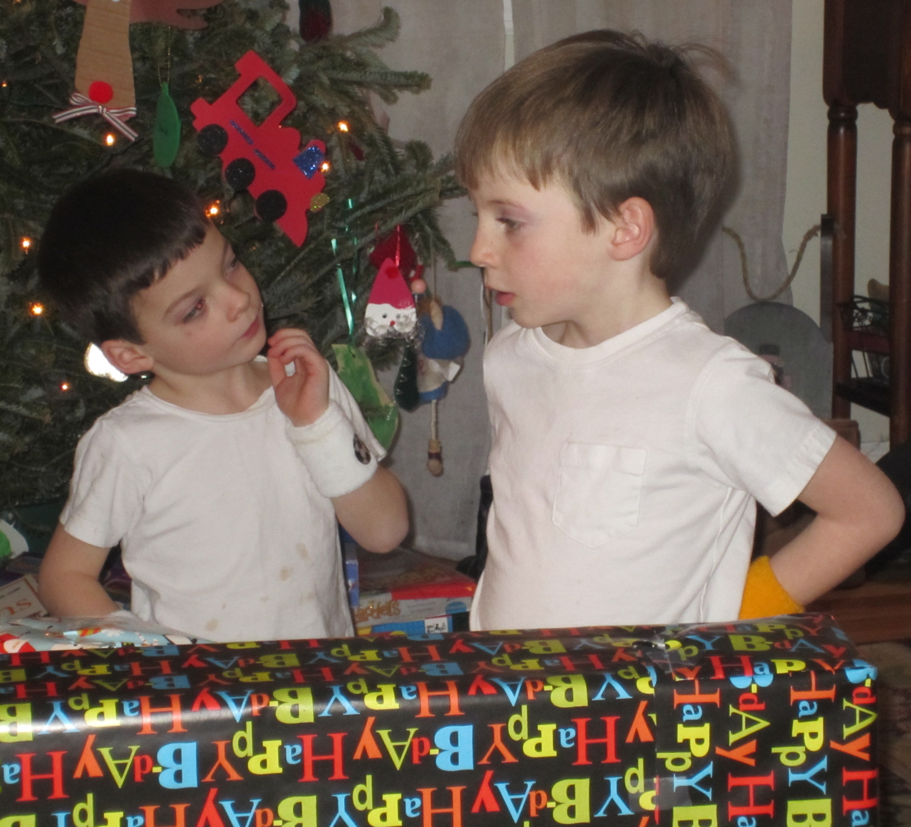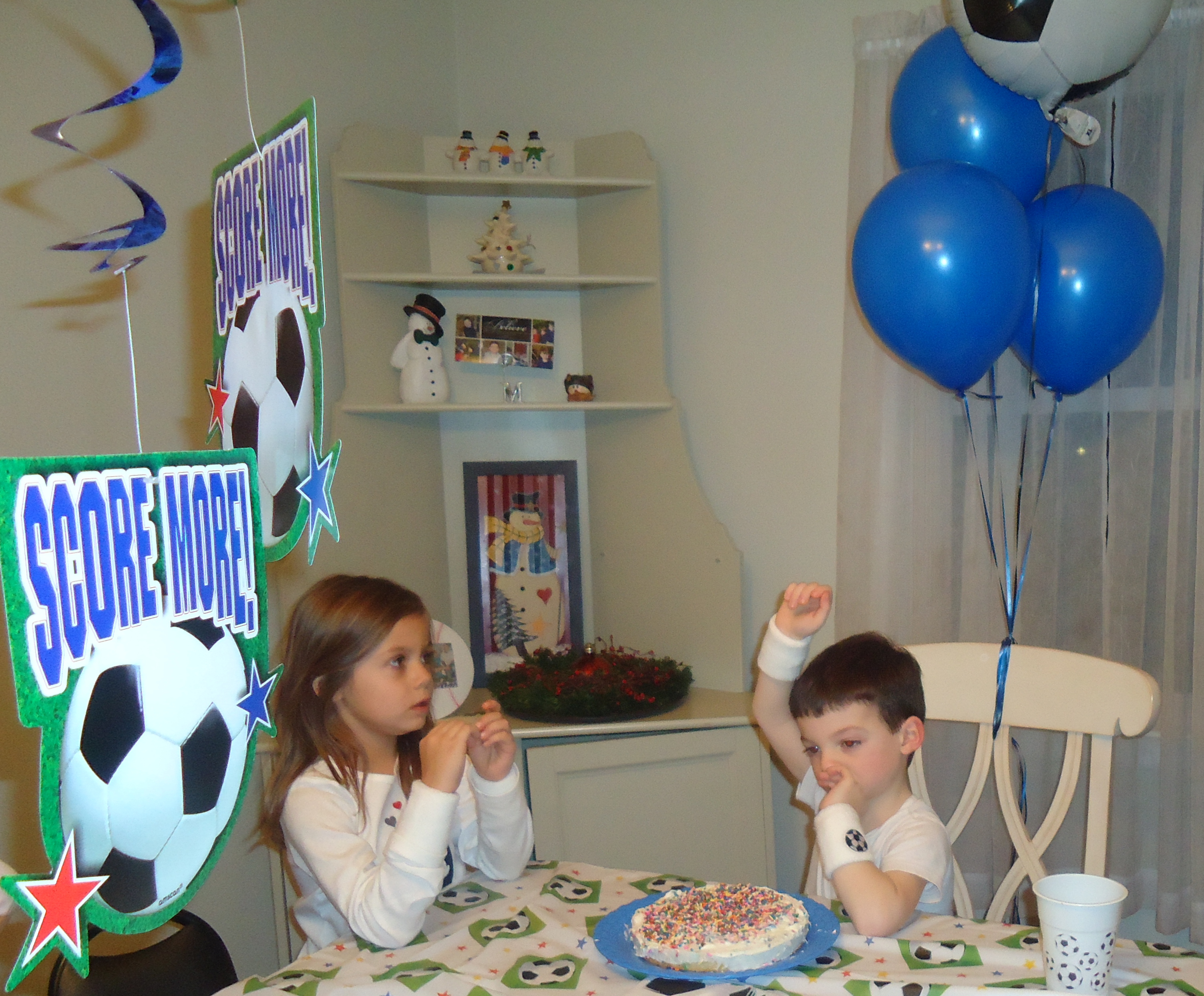 Later that day we had our relatives and some friends over for a party - the theme was SOCCER and we got more presents. Here is a picture of Daniel and I discussing who is going to open the big present. We got a Dart Board and Uncle Scott gave us New Providence Soccer Shirts.