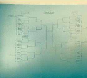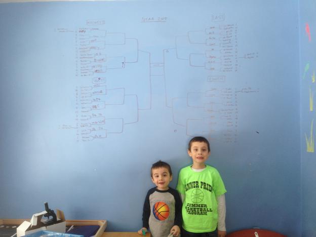 March Madness has begun in our house. Daddy drew the Brackets on the wall. He says he used eraseable markers. We will see what color this wall will be in the future