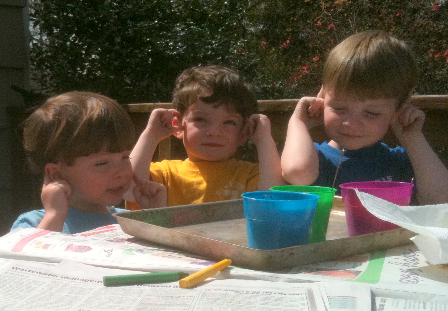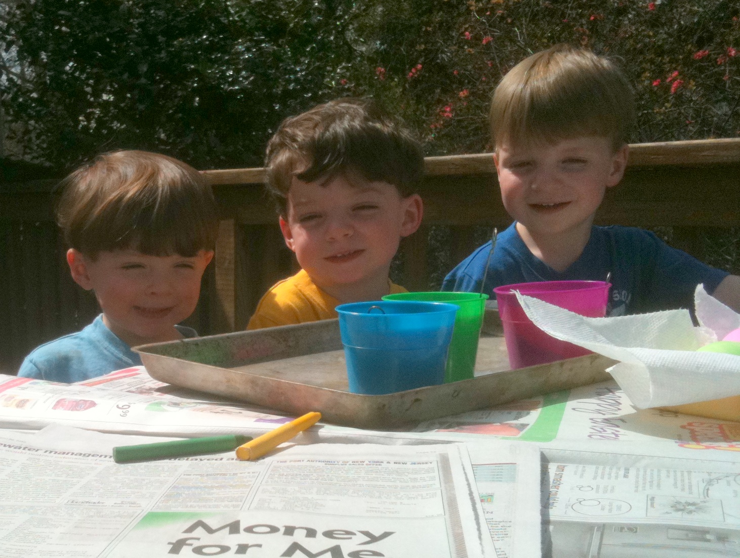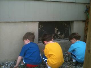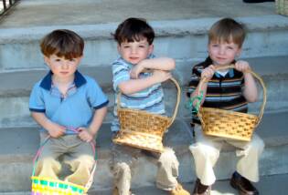 Here we are playing in Mee-Ma's rock garden. Of course she does not know we are playing in it. As soon as we hear her coming we head to the deck and make out we are playing the "ear" game and getting ready to do some egg coloring