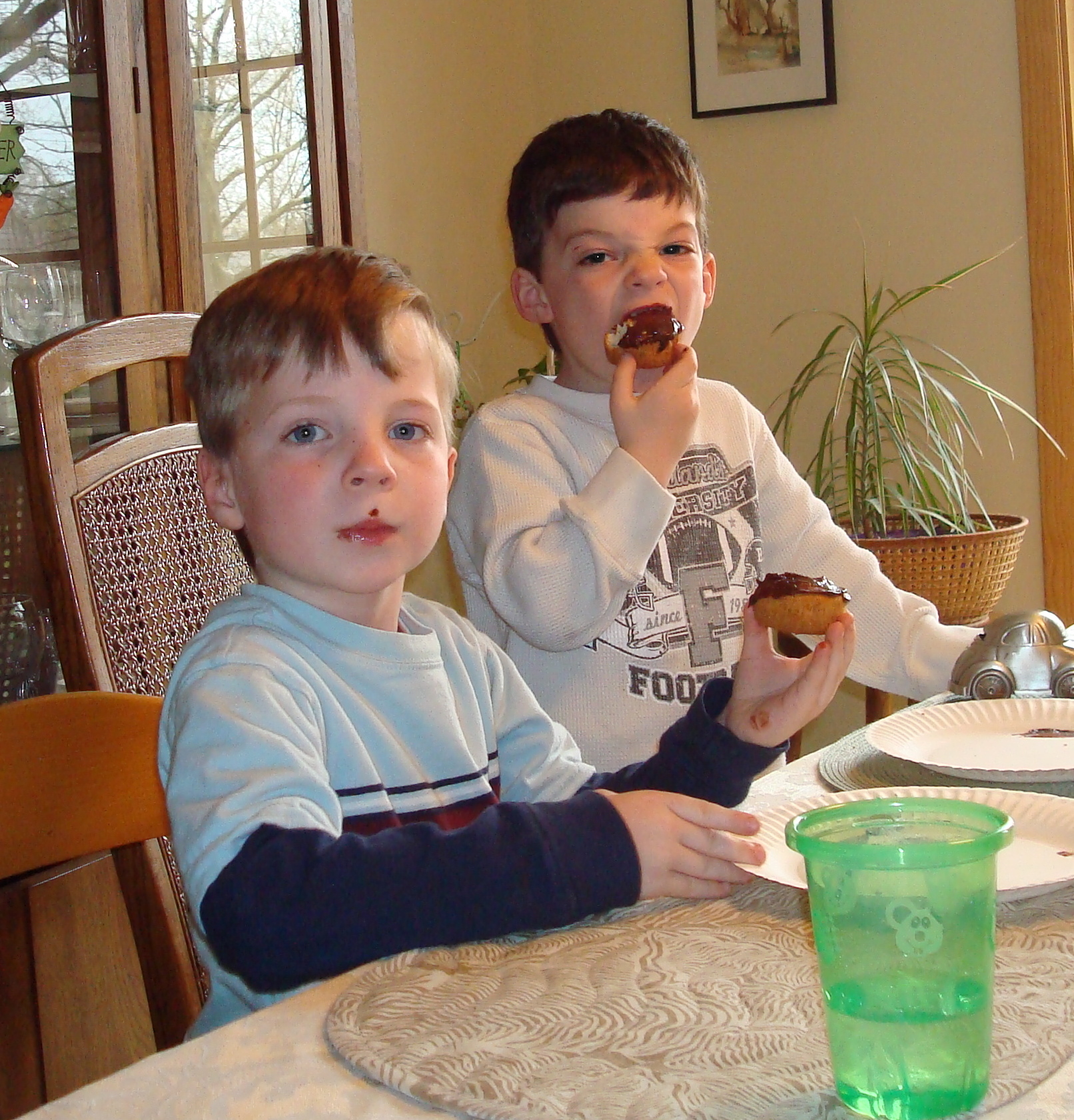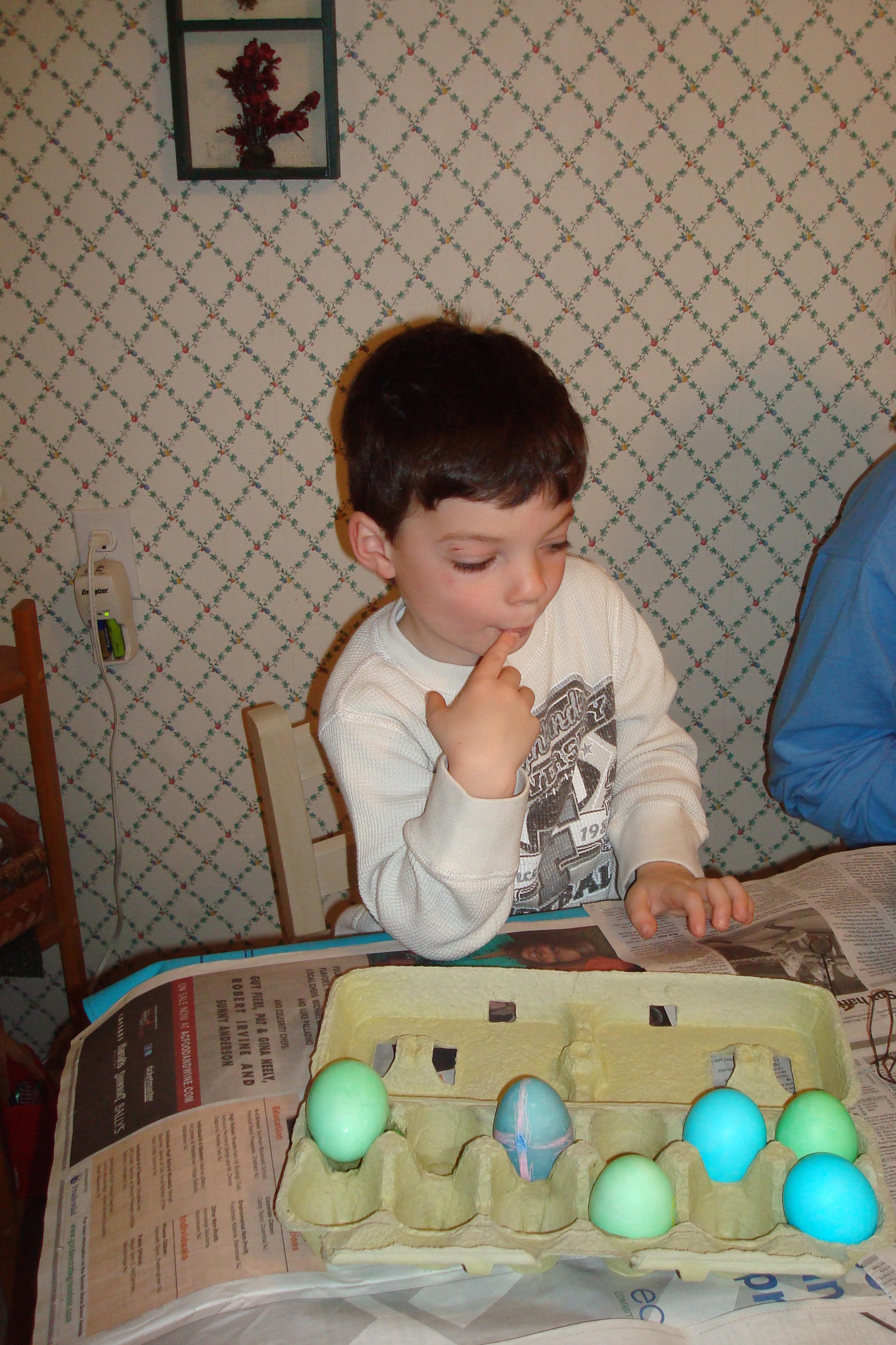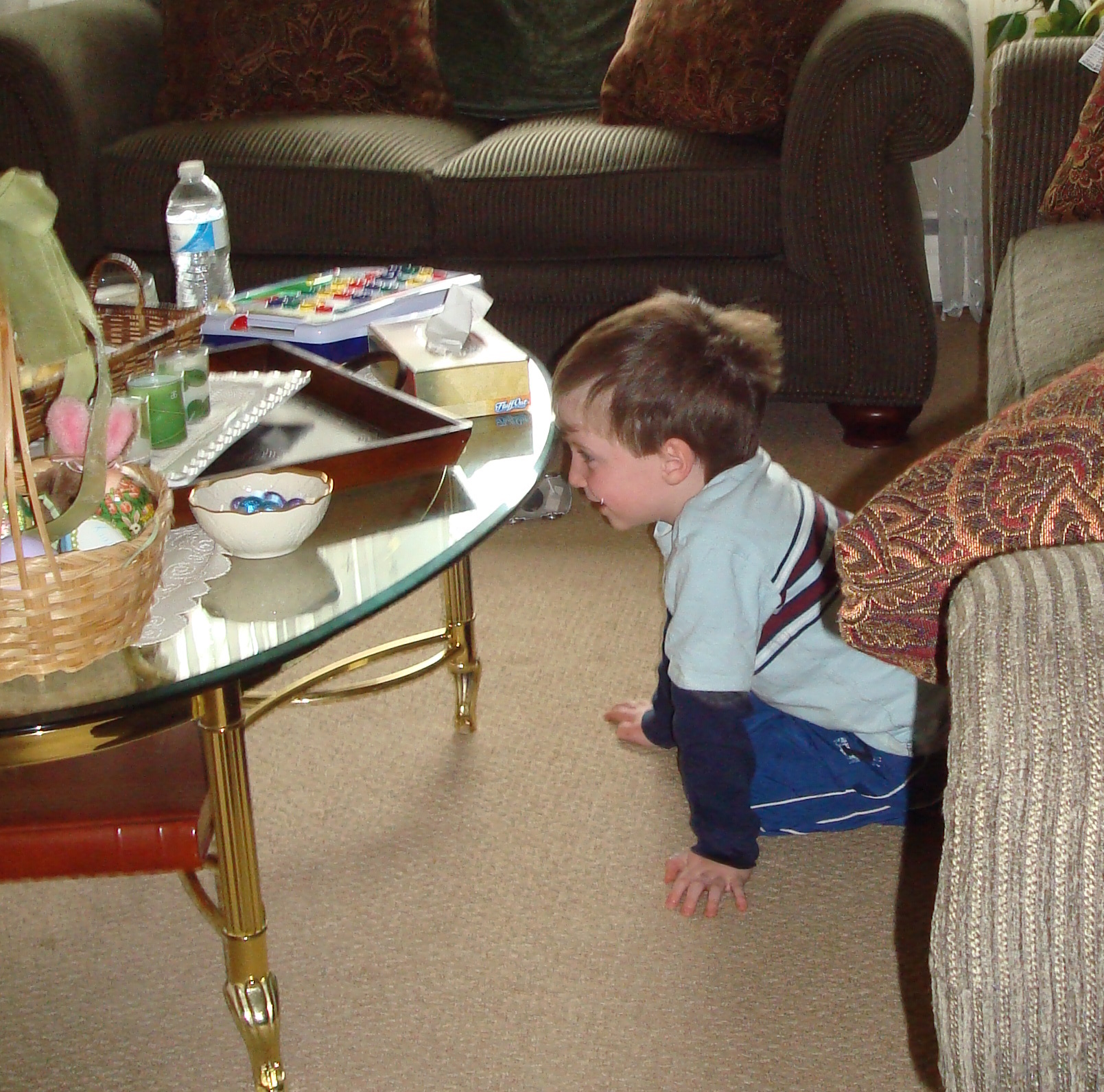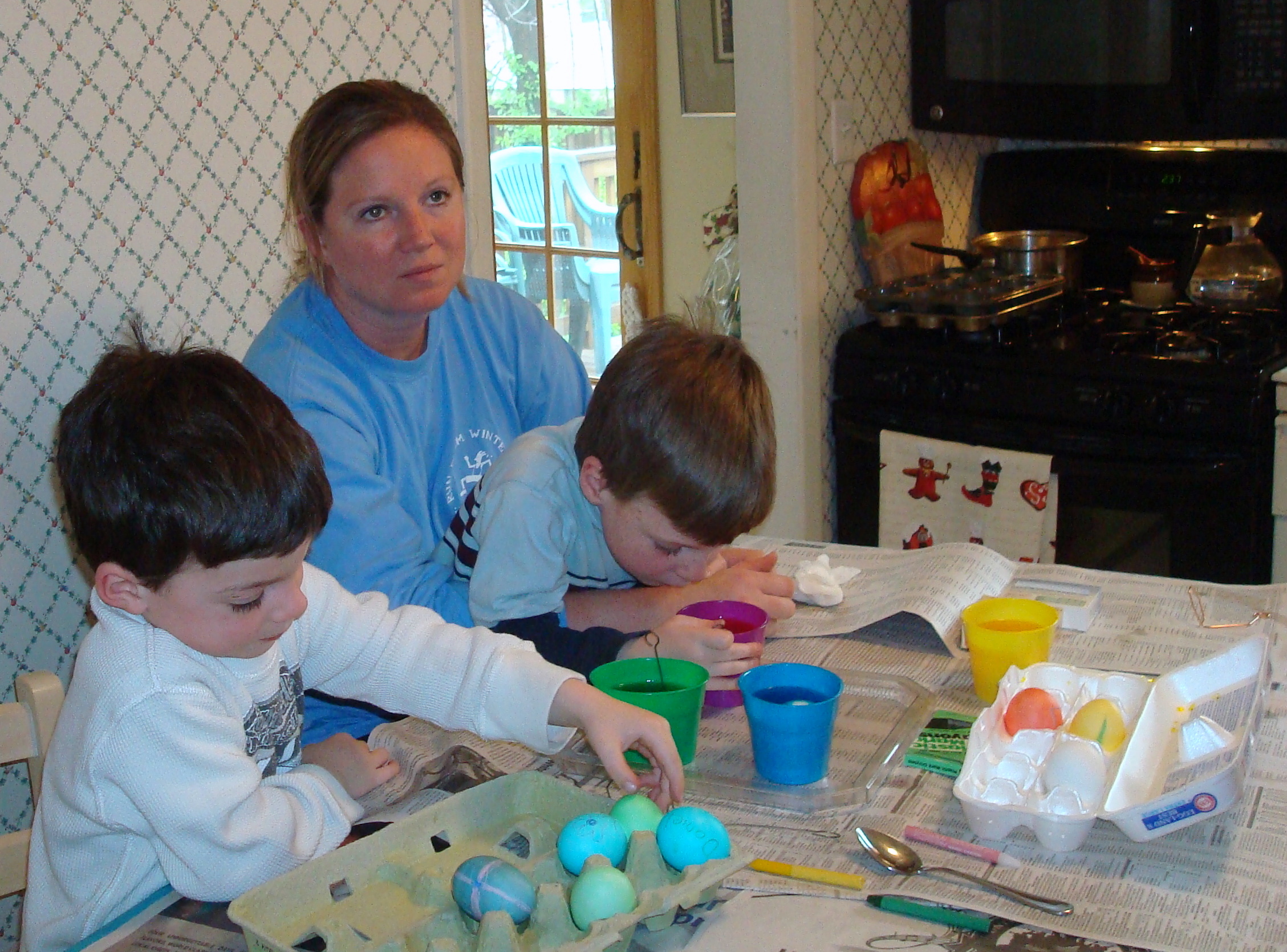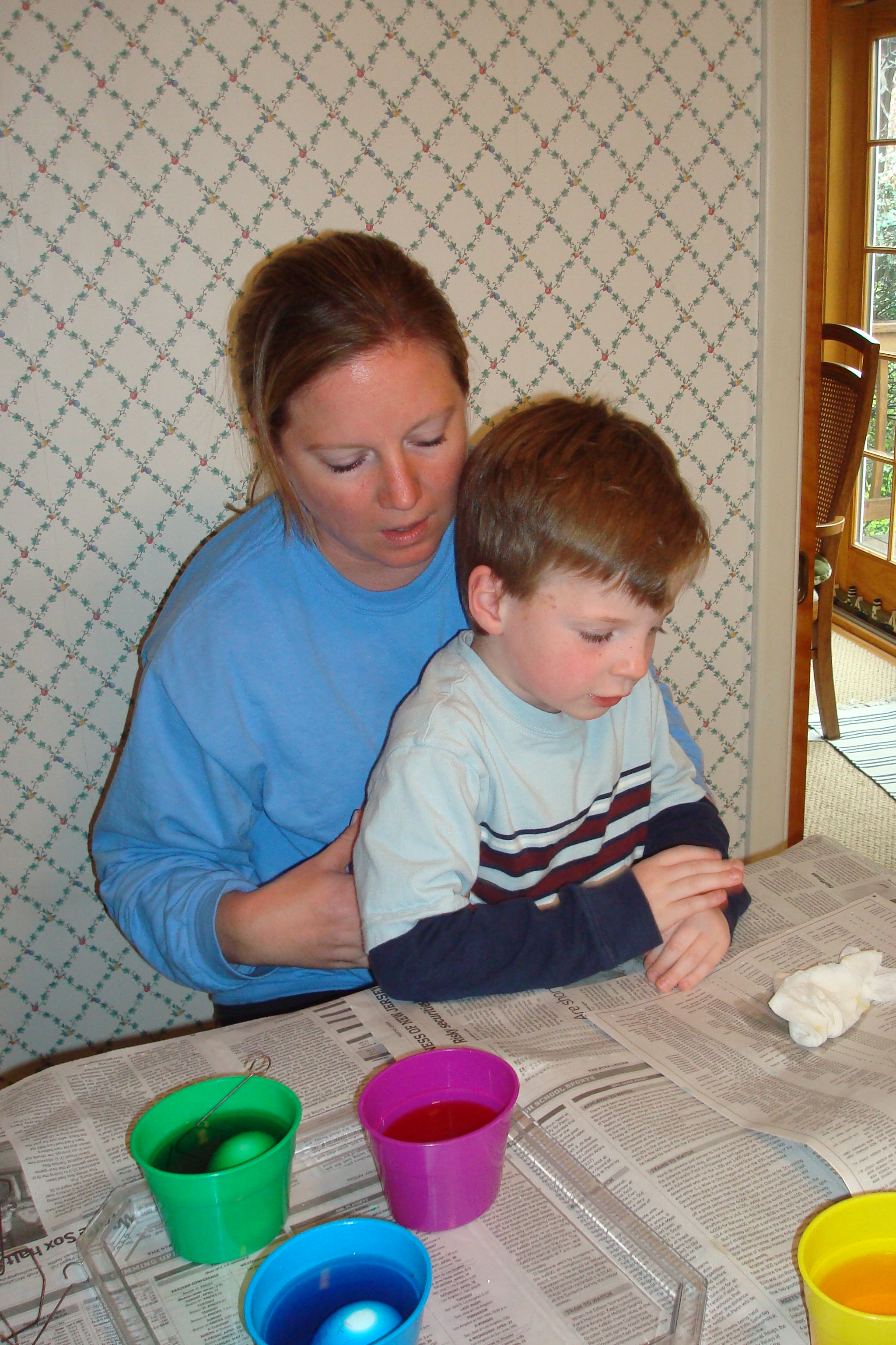 We went to MeMa and Pop-E house to color eggs and have some chocolate donuts. Plus Daddy was also eating the donuts. Also Daniel found out that if you look through MeMa's table you can see double on the other side. The best is when we moon" each other.