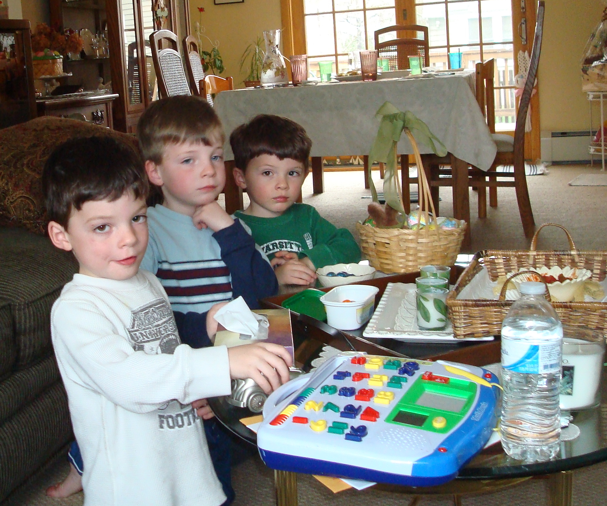 MaMa and Aunt Whit (Auntie) went to visit a friend who just had a new baby. The DaDas were watching Trey and I and we wanted to play a game. Both DaDas said after we ate dinner we could play the game. We started eating at 5:45pm and Trey was finished at 5:50pm. I finished at 7:00pm and MaMa came back at 7:05pm. Between 5:45 and 7:00, this is what happened.