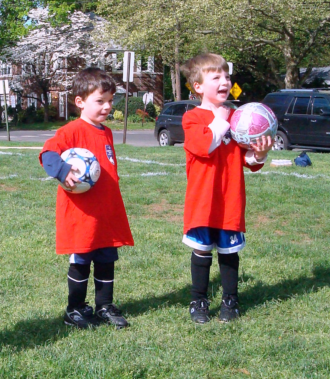 Another morning of soccer. Here are my brothers in their proper attire (uncle Scott insists on them wearing "soccer" outfits. Look I found another use for soccer balls.