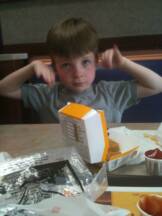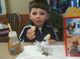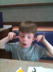 We and Daddy had a test of wills yesterday at Wendy’s. We were getting ready to eat lunch there and we were not behaving well at all. Some worse than others, so Daddy picked up our stuff and walked out instructing us to follow saying we were eating outside. With some slight push back we eventually followed. We got to the car and Daddy told Christopher and I that we wouldn't’ be getting anything to eat and Daddy then proceeded to feed Luke. Christopher and I continued to be out of control in the car ride home. Then we got home and Christopher and I were shocked that we still weren’t getting our chicken nuggets and french fries. Eventually Daddy caved in at dinner time and we each got two nuggets and some fries, which is all that was left between Luke, Daddy and Mommy eat the rest on the ride home