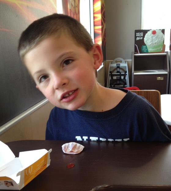 Luke had a class trip so Christopher and I went to KIDZ PLACE with Pop-E. It was only the 2 of us and then a Mommy came with her 2 kids. Pop-E could not believe it was so loud with only 4 kids and ask how it was with a lot - We both said LOUD, VERY LOUD. And then some ice cream at Mickey D's. Oh notice Christopher's new spectacles