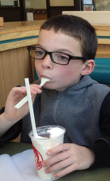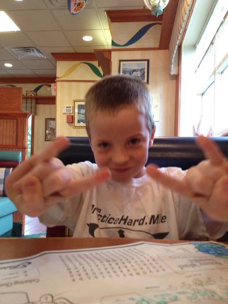 Pop-E and I are at Friendly's and I am giving him the "ROCK" sign