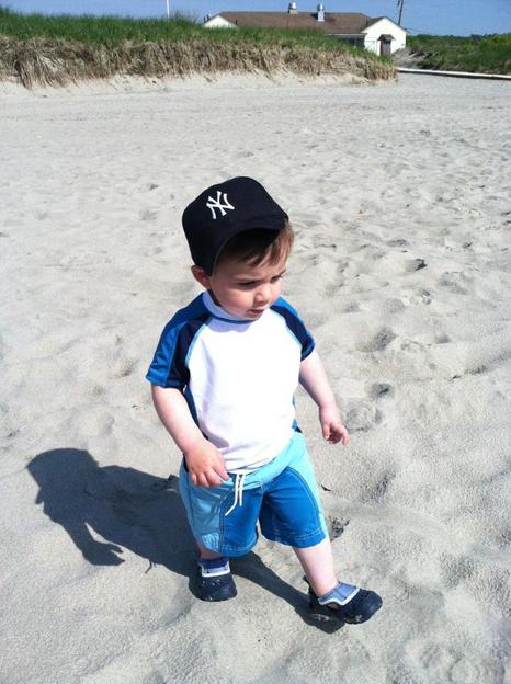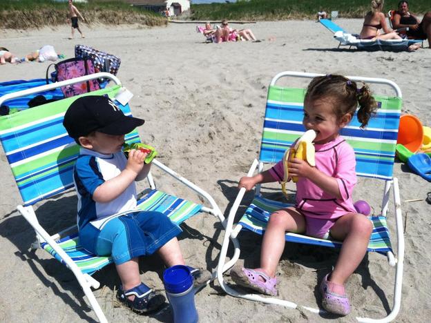 Lily and I having a snack on the beach at Good Harbor, Gloucester, Maine. Notice the yankee hat, Mommy must be napping