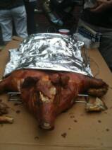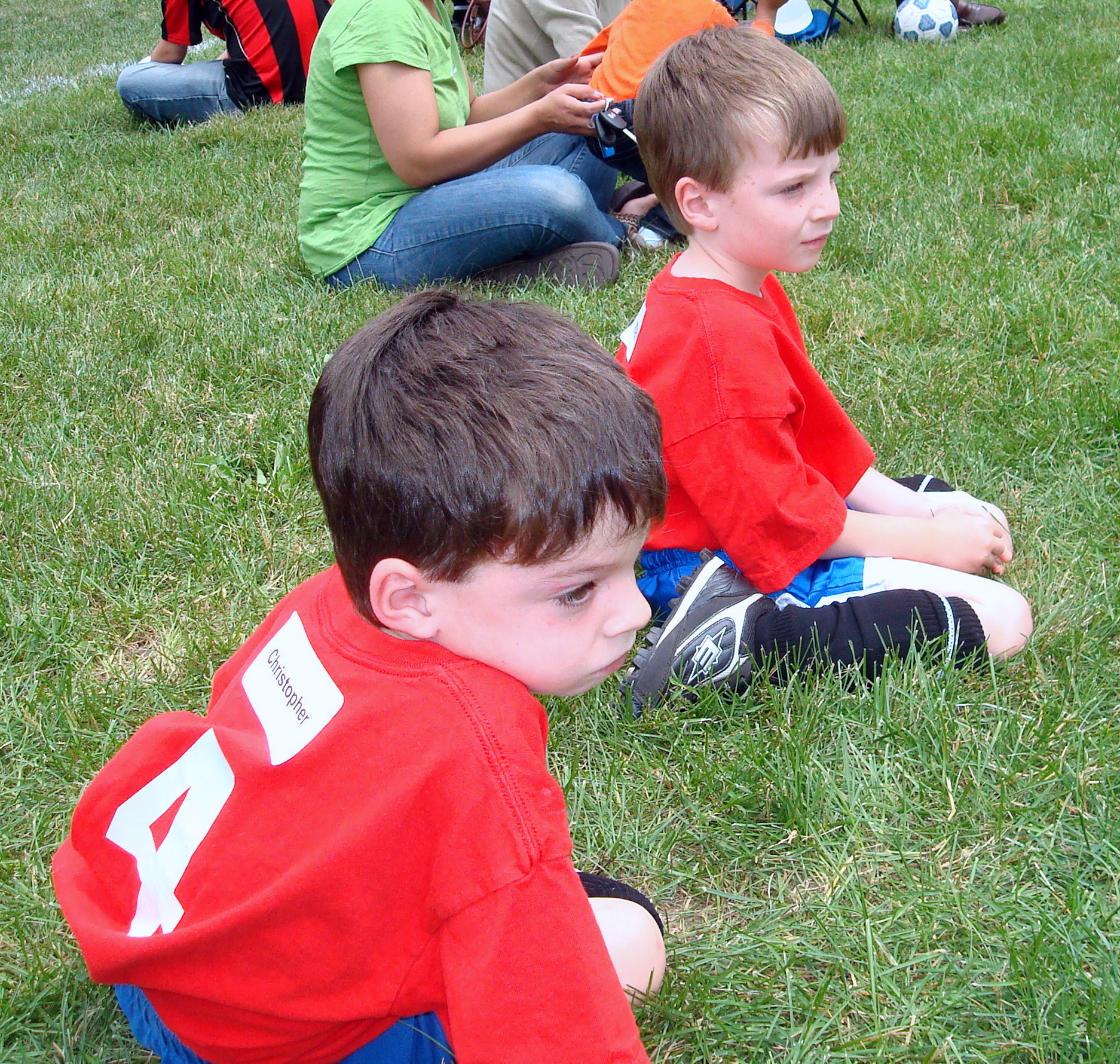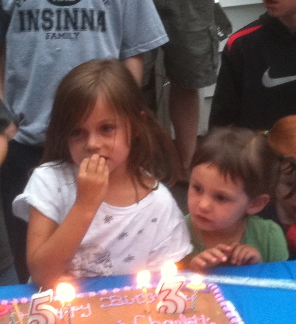Another day of Soccer. Here Daniel and Morgan are "eyeing" each other and someone is "eyeing" me. Then some running and then some resting. After the game we headed to PopPop's for his "BIG PIG ROAST". PopPop always wanted to do one and finally made it happened. And to top it all off there was a birthday cake for Madelyn and Charlotte