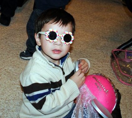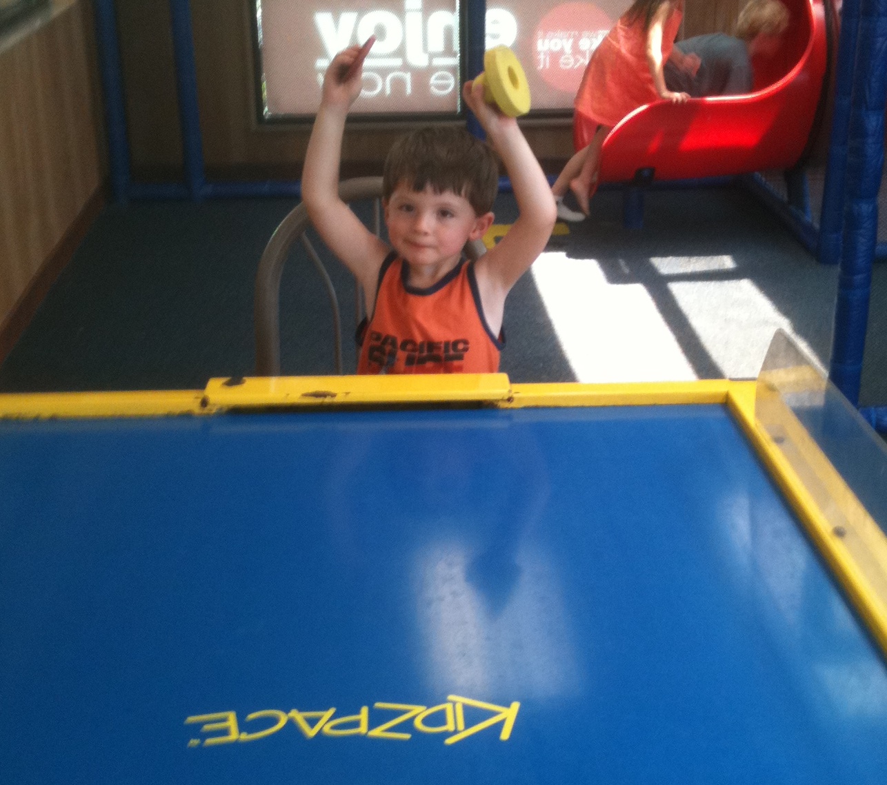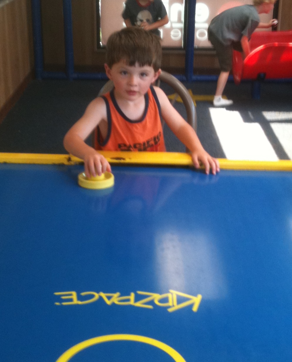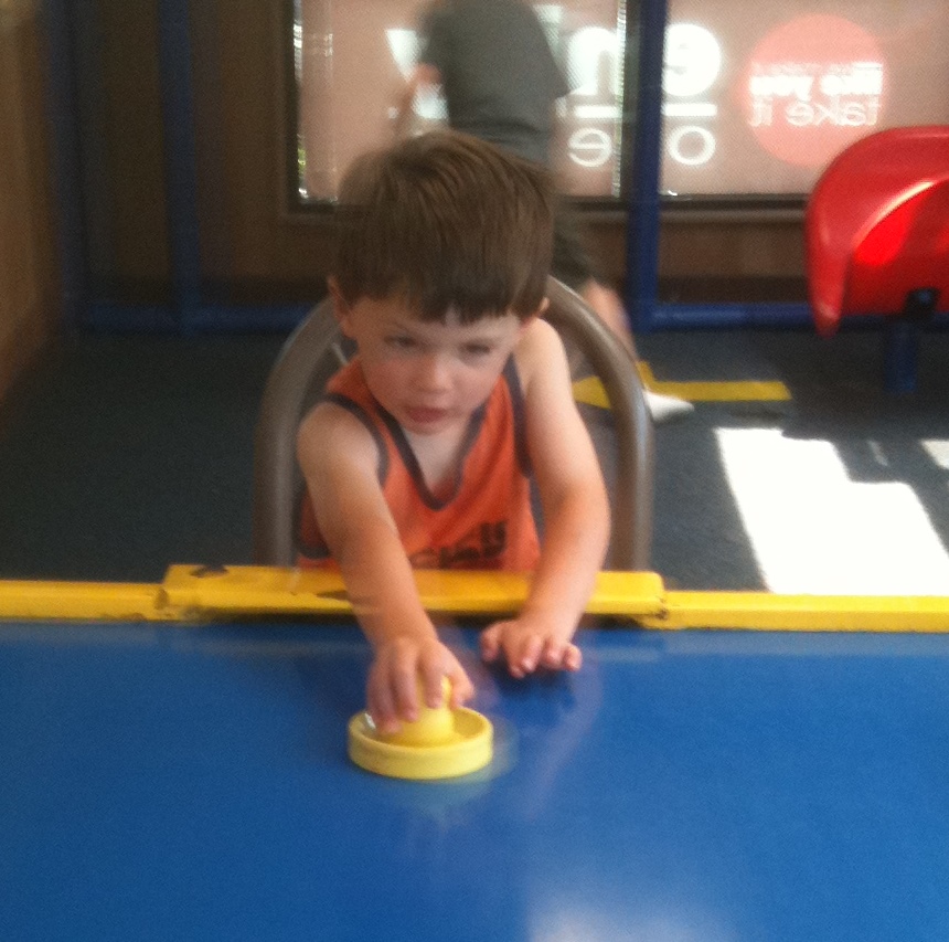 They have a AIR HOCKEY game I am always begging him to let me play. He tells me the I have to be 4 years old because that how old Christopher and Daniel were before he let them play. Now do I have some influence over Pop-E, especially when I turn on the charm - here the results.
