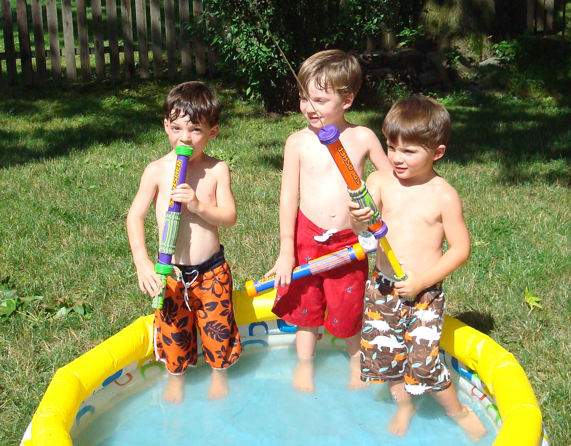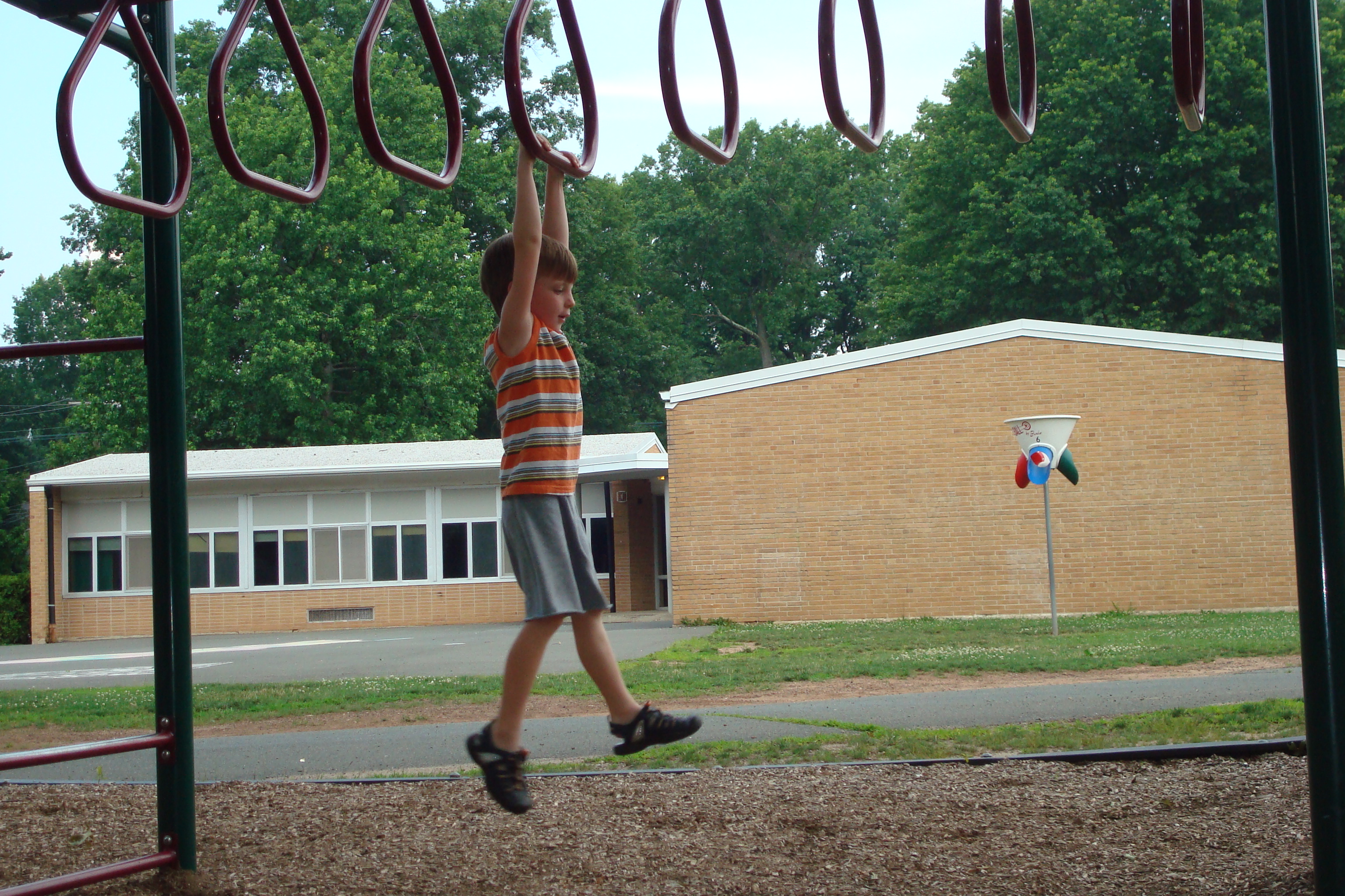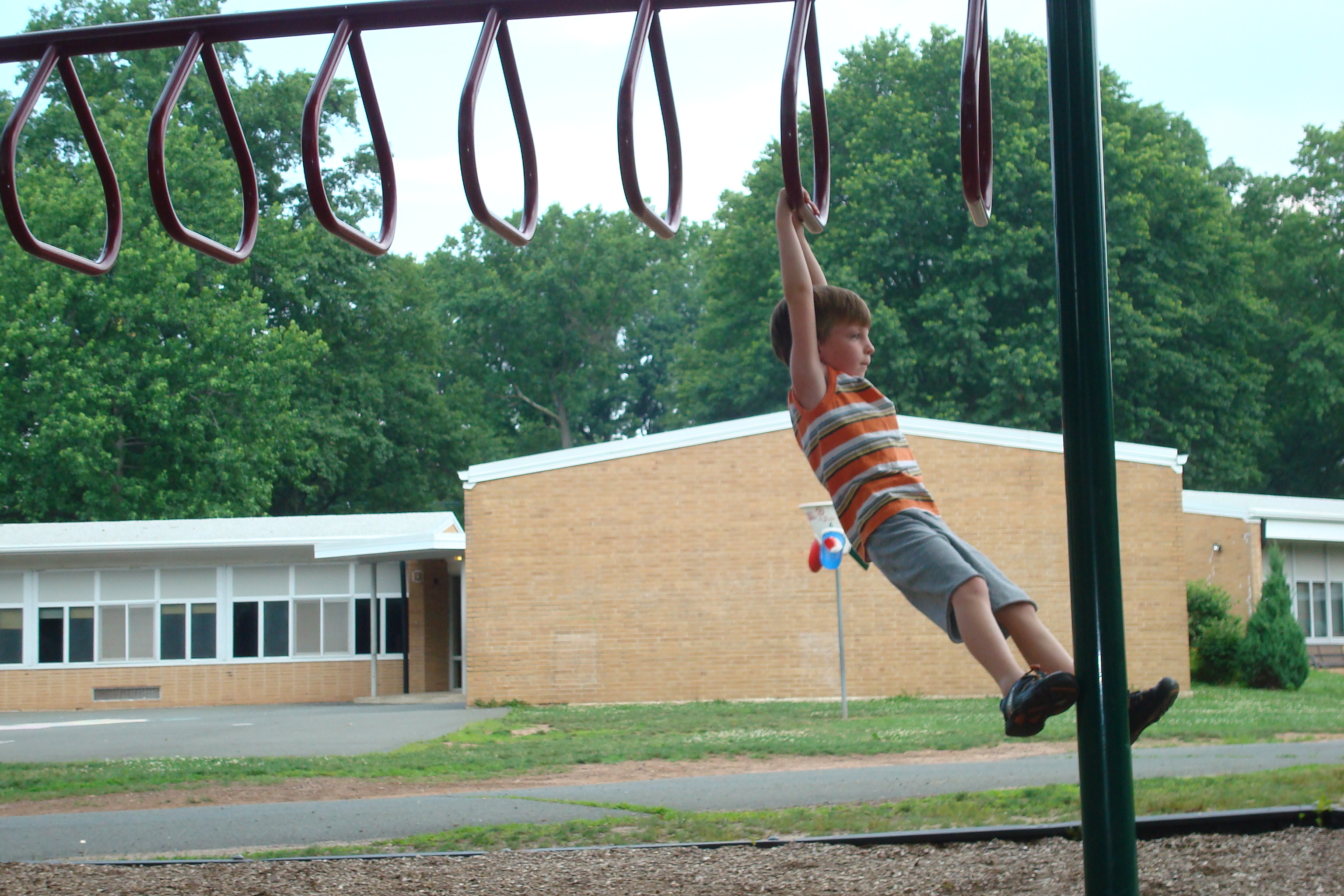 Doing some gymnastic routines at the playground. When we got back to Pop-E's, Luke was there playing with the Super Soakers. After a while we went in to have our clothes dryed