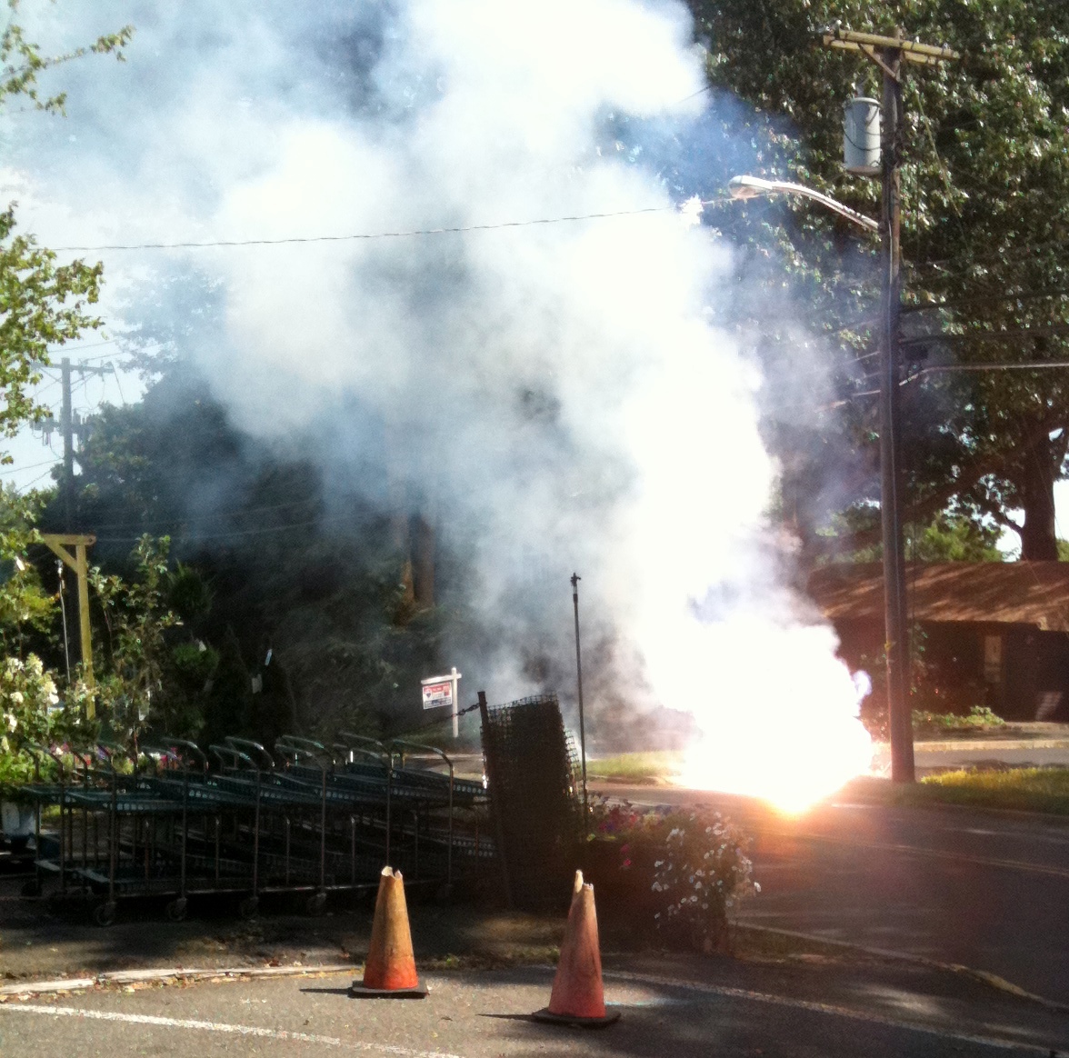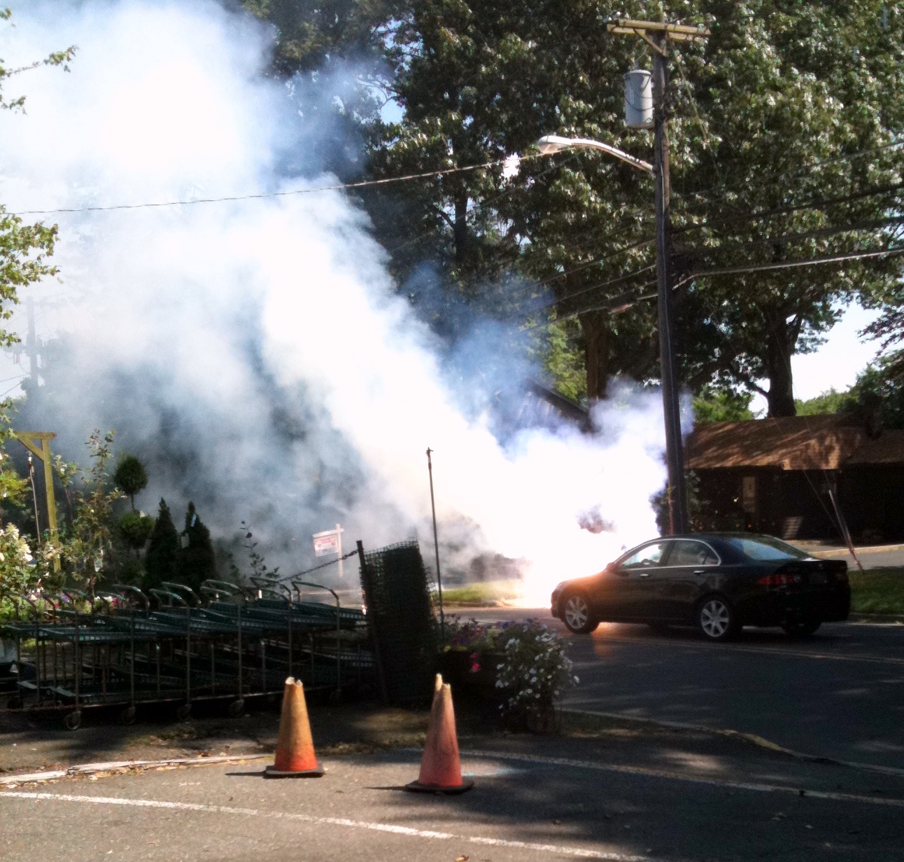 Pop-E was it MeMa at the nursery looking at plants when all of a sudden there was this boom and the lights when out in the nursery. Everyone bolted outside and Pop-E took some pictures of a fire that was caused by electrical wires hitting the ground