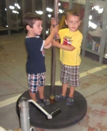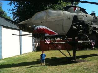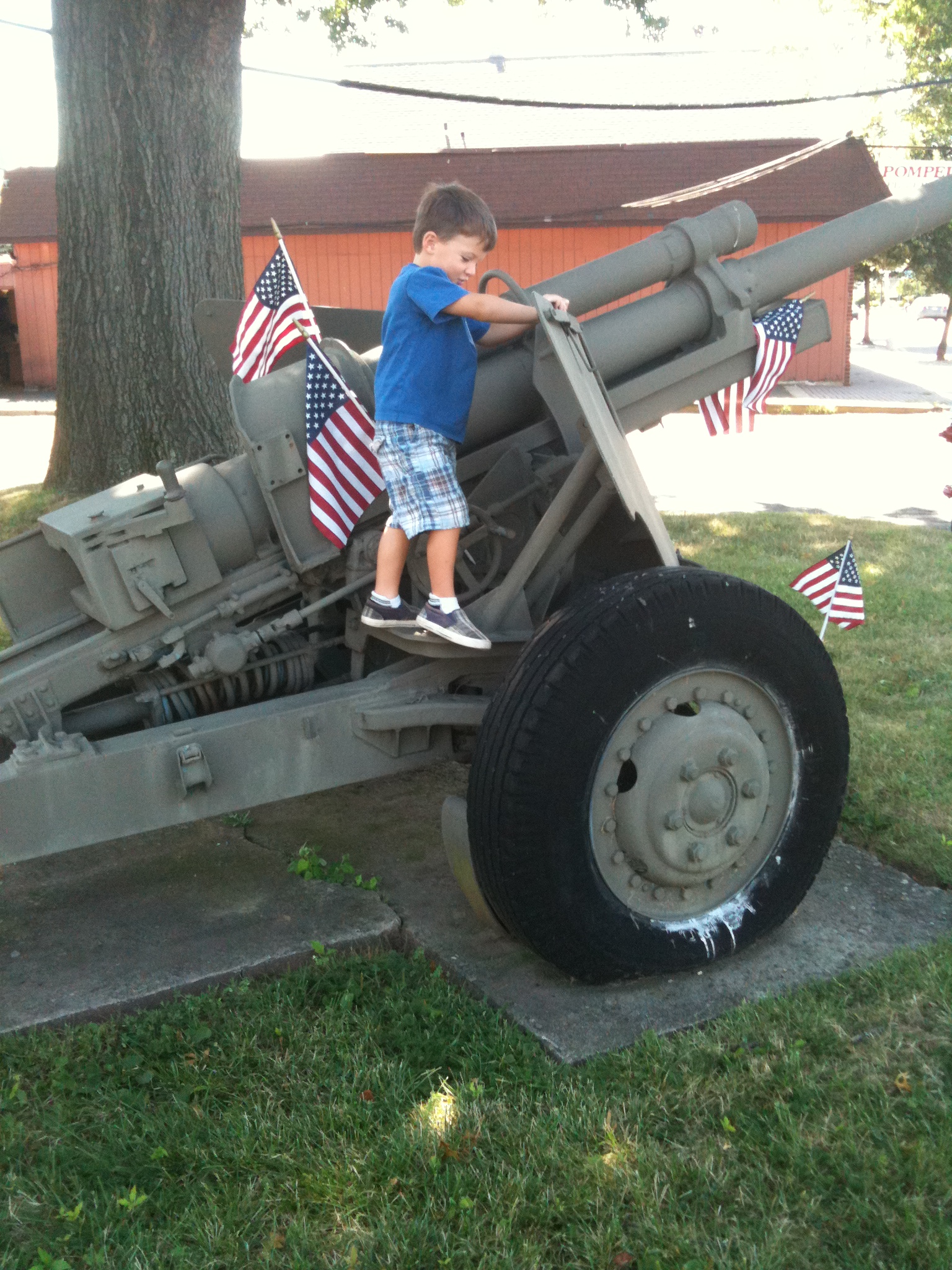 I am with Pop-E because the BROs are at camp. Pop-E is always looking for new things for us to see. This time he took me to see an helicopter and howitzer.
