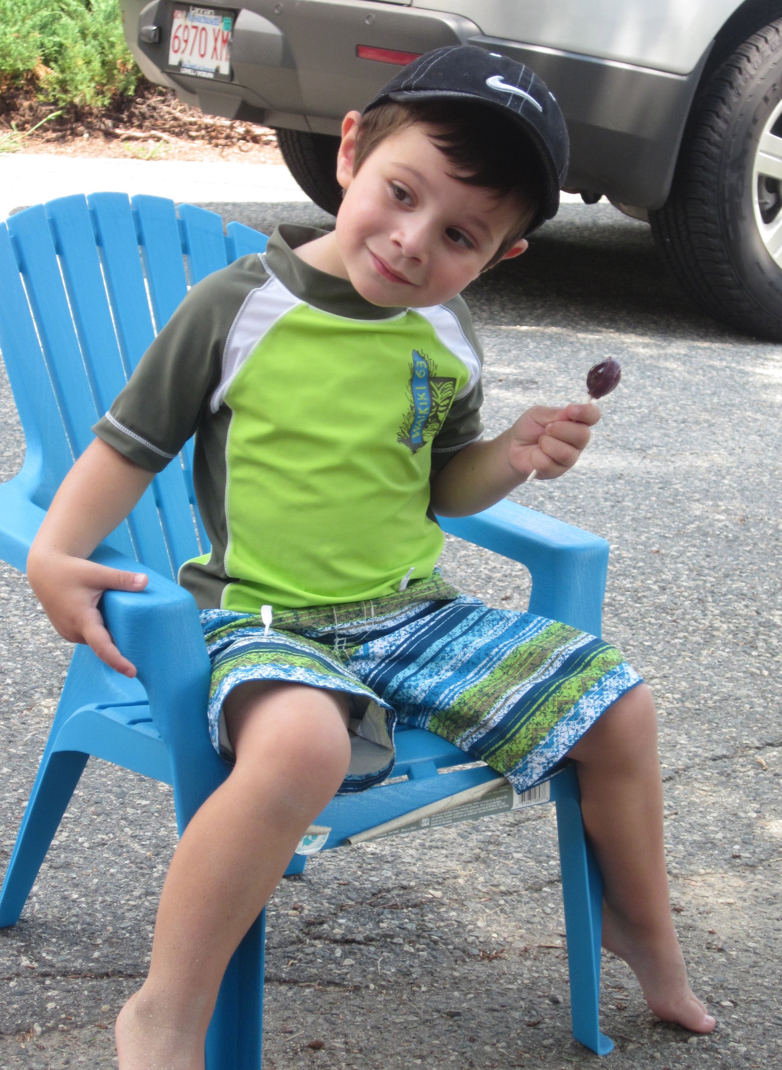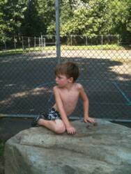 After watching the boats for awhile Pop-E took us for ices (we wanted RAINBOW) and then sat in a covered area to eat the ices and watch the boats. All of a sudden who shows up but Luke, Uncle Scott, James and Jessie. Luke said the light saber was just a Broken wooden knife handle. He also saw that we had ices and said "did any one buy me one". Pop-E told him that he went with Uncle Scott and we did not think he was coming back. He gave the "sad" look and Uncle Scott took him for an ice - of course rainbow. Daniel and Luke had it all over themselves while I did not get a drop on me.
