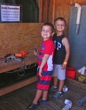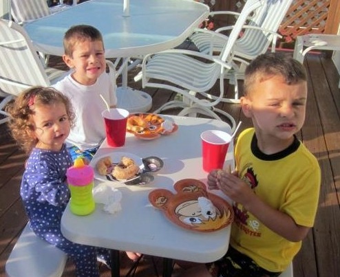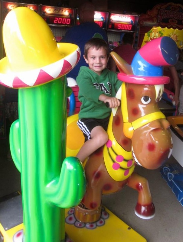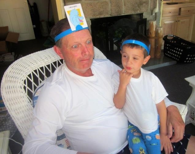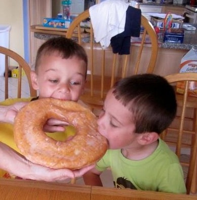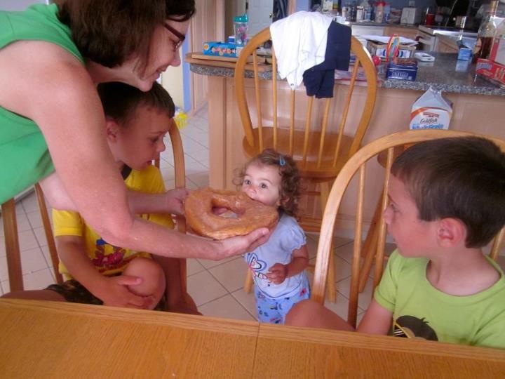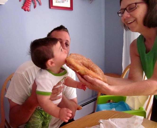 We are at the beach with Grammy, Grampy, Aunt Whit (Uncle Chris was working) Trey and Lilly. There was sand (always remember to cover you head in the sun), snacks, computer time and games. Pop-e always says he can smell the "wood burning" when I look like I am thinking - do you think that is what Grampy and I are doing. Trey and I discusing who will be the player and who will be the catty. Grammy really out did herself in the kitchen. Look at the size of that donnut. We all had a bit. And of course Mommy had to get in a hug and kiss